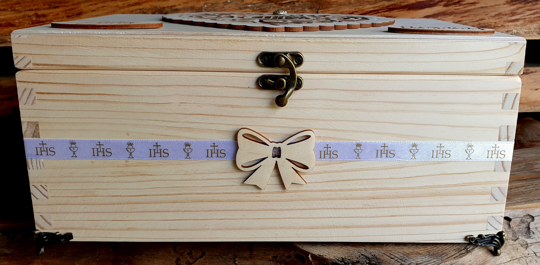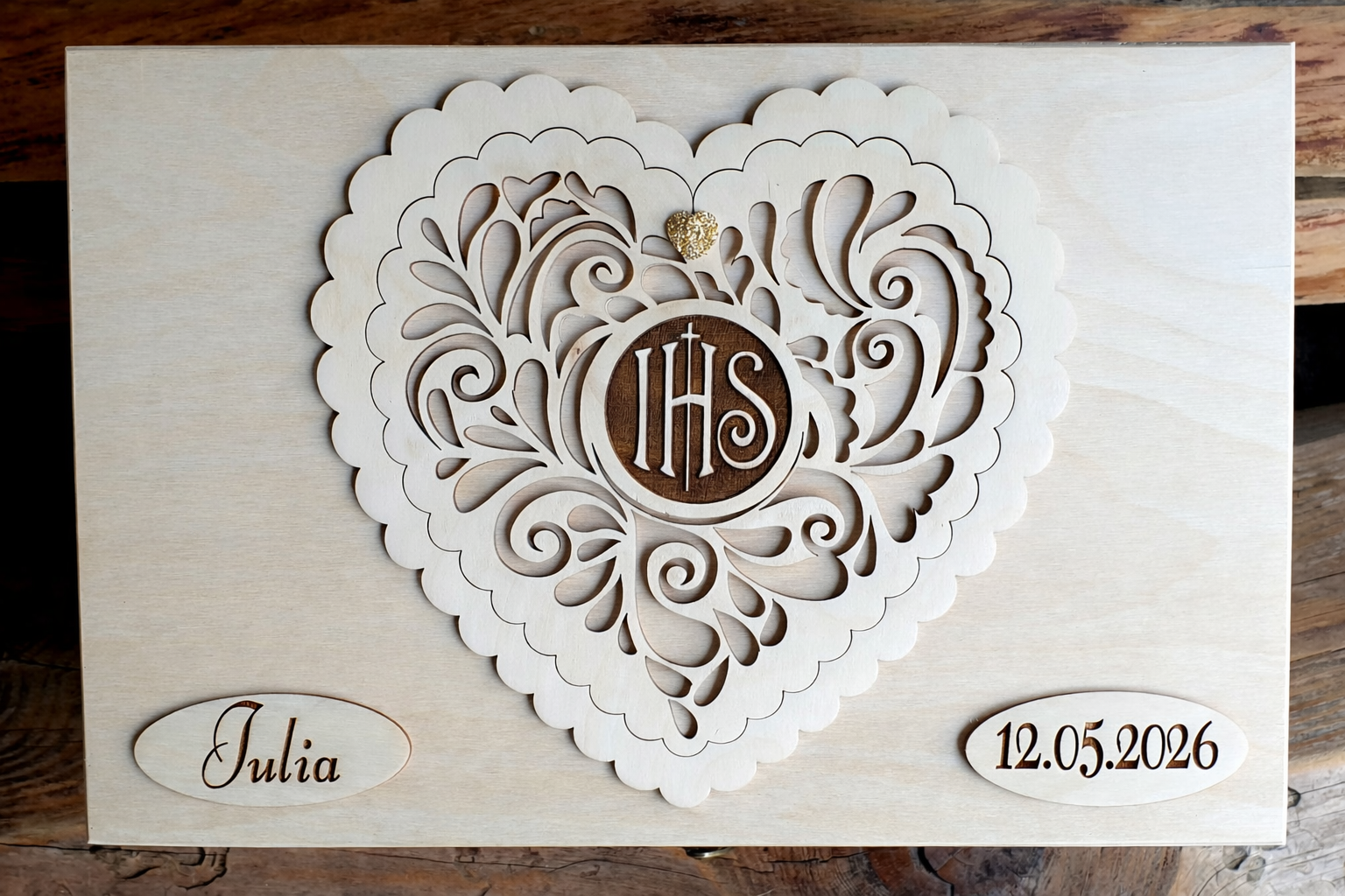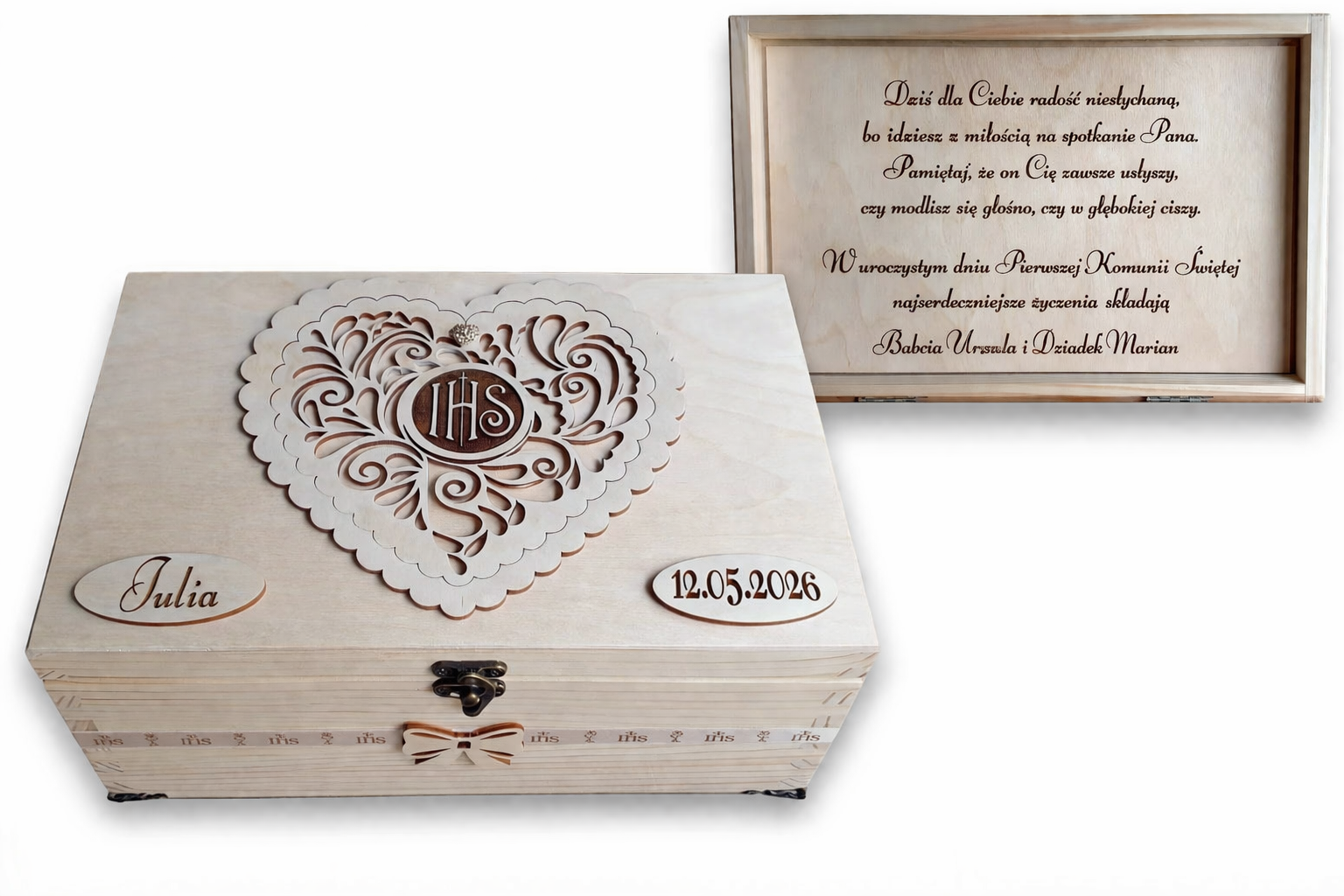 Drewniana szkatułka komunijna XXL z grawerem i magnetycznym sercem IHS