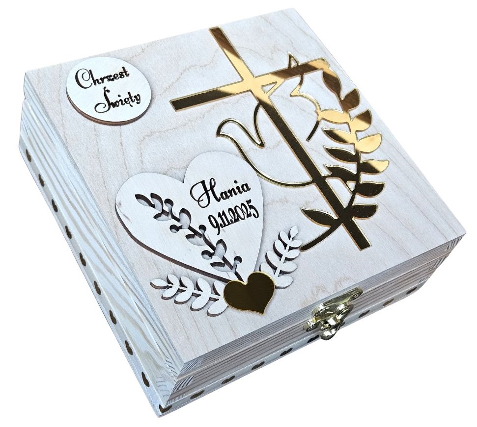 Szukasz eleganckiej i trwałej pamiątki Chrztu Świętego? Drewniana szkatułka z indywidualnym grawerem to wyjątkowy sposób na wręczenie pieniędzy, medalika lub drobnego upominku w dniu tak ważnej uroczystości. Naturalne drewno w połączeniu ze złotymi dekoracjami tworzy ponadczasową i elegancką kompozycję.