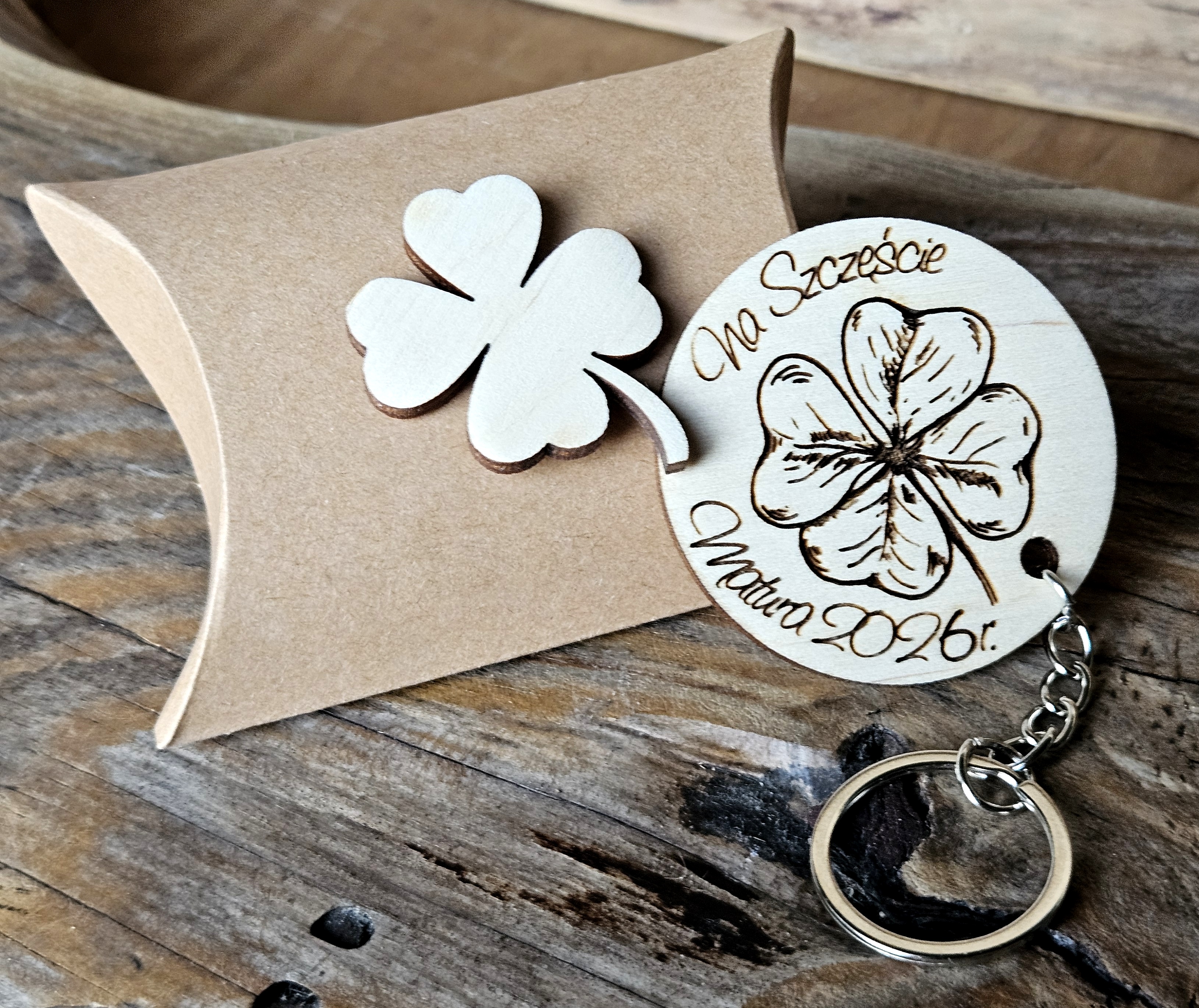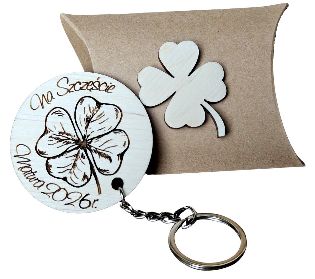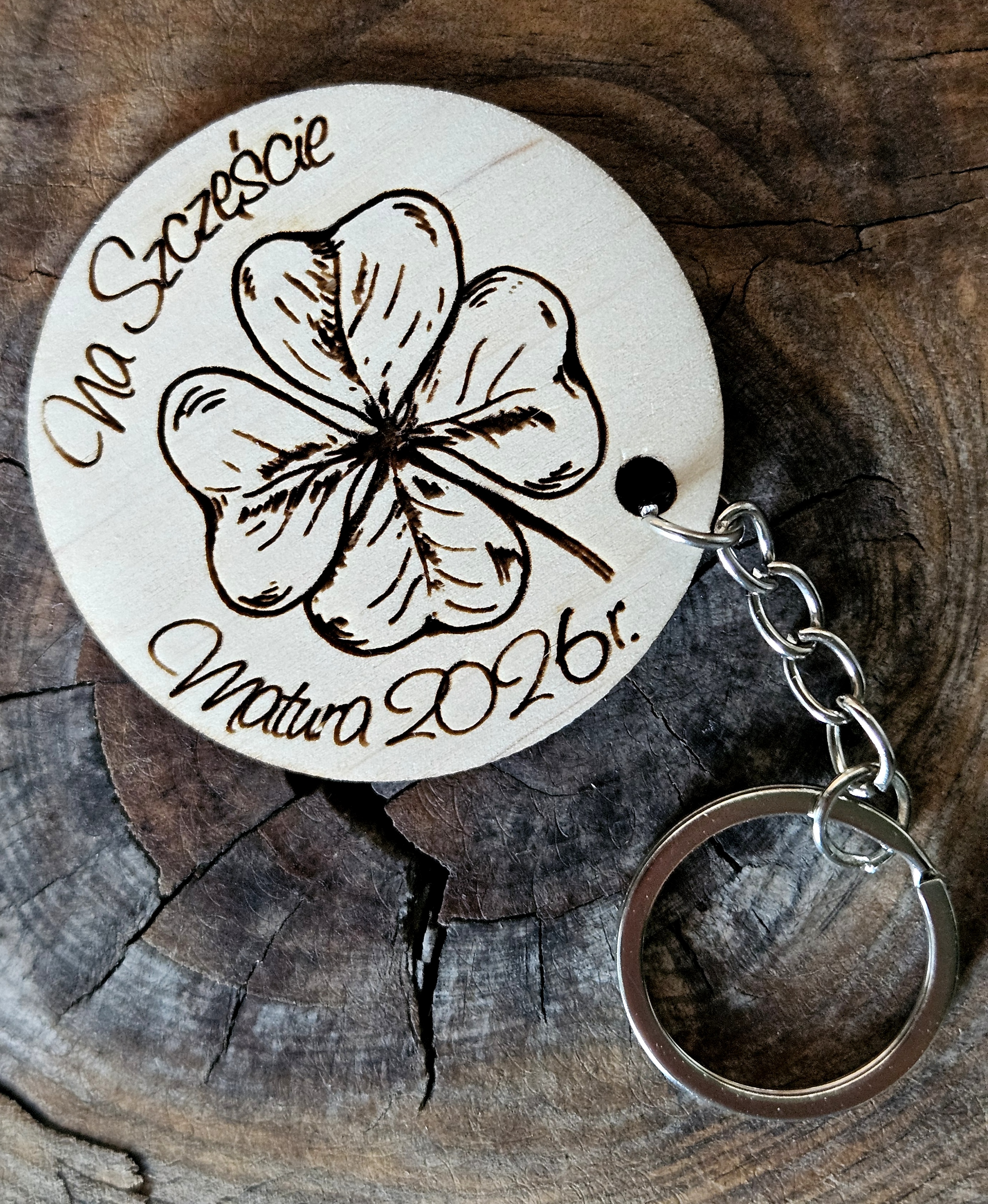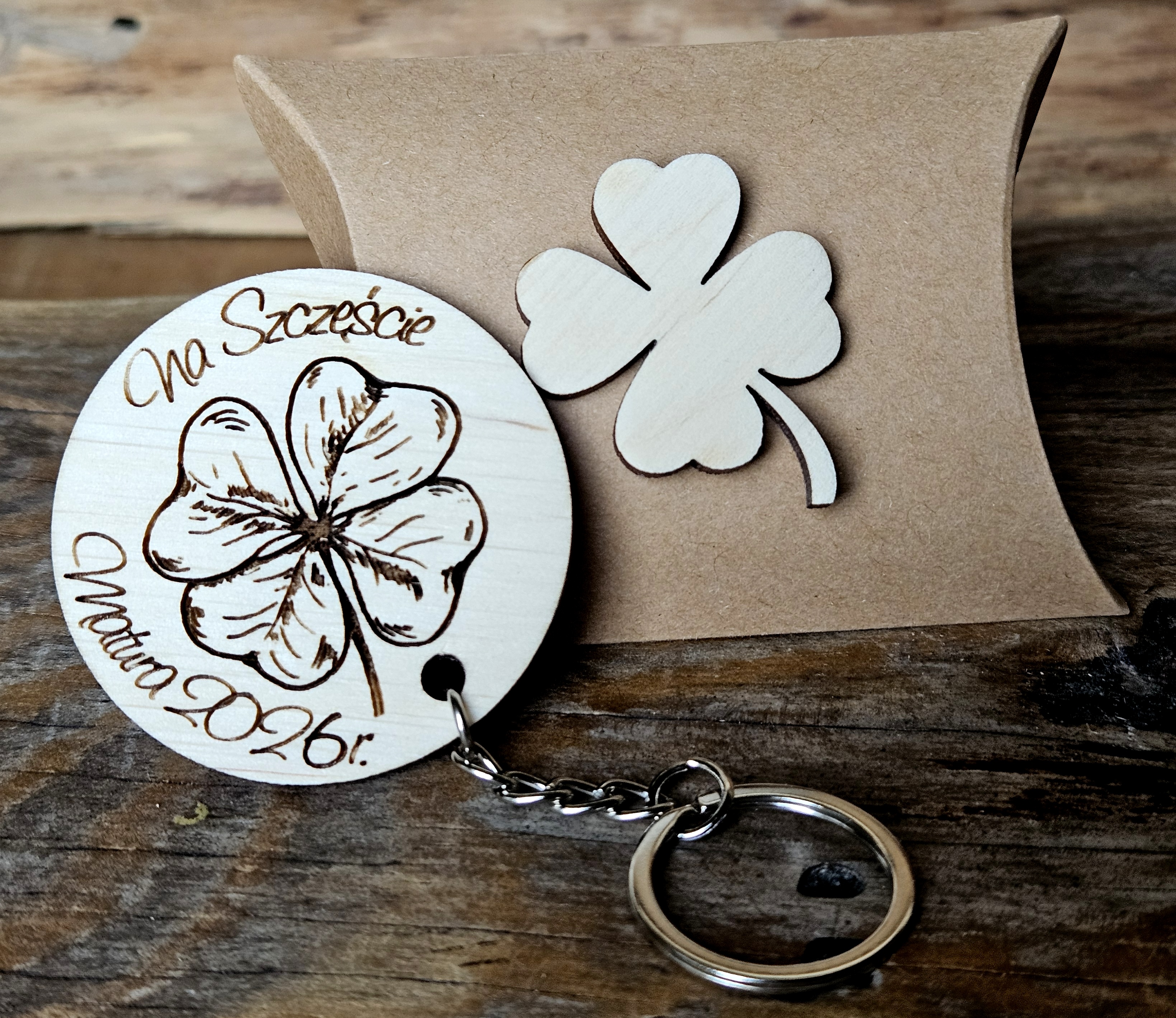 ✔ Drewniany brelok z grawerem: „Na Szczęście – Matura 2026” i grafiką czterolistnej koniczyny
