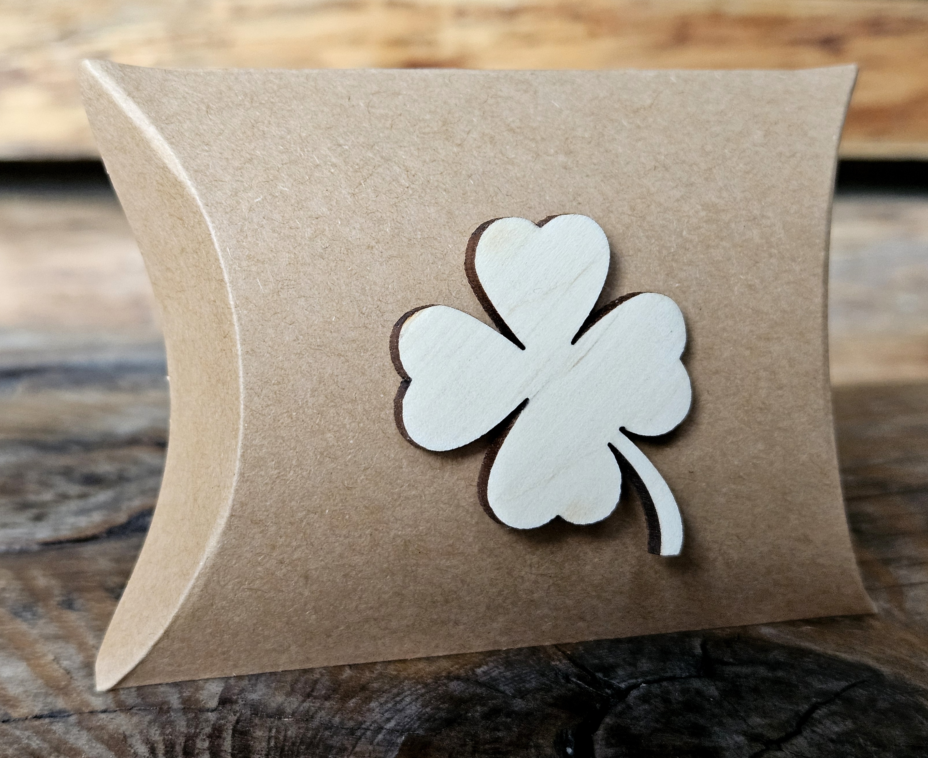 ✔ Kartonowe pudełeczko prezentowe typu pillow box z naklejaną drewnianą koniczynką