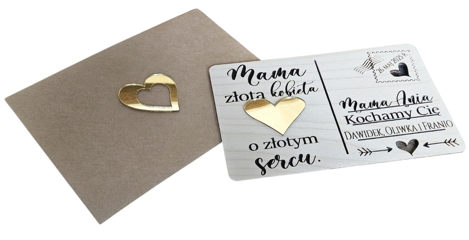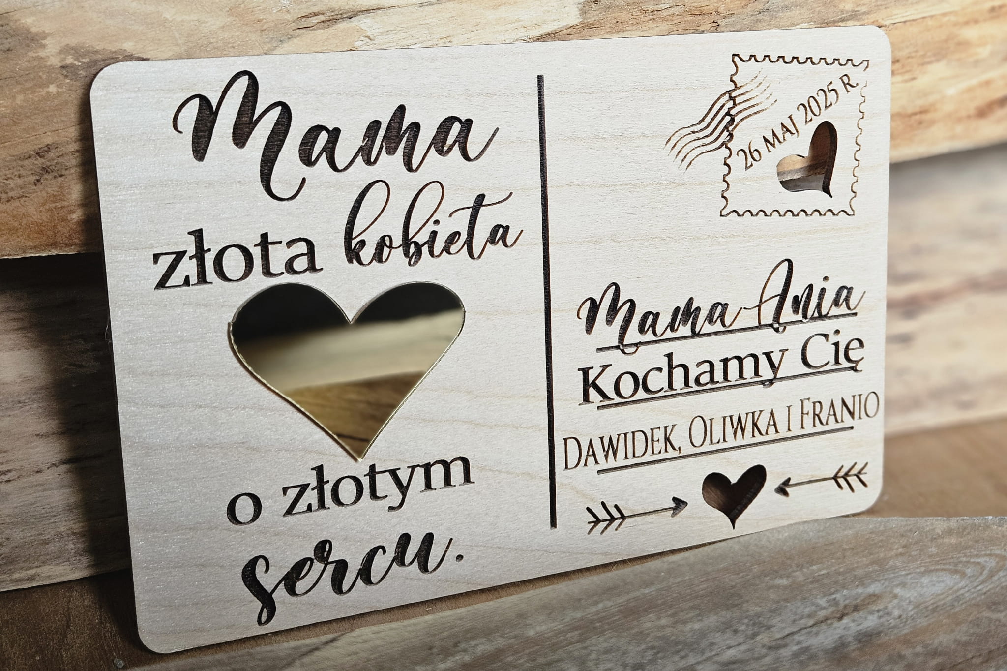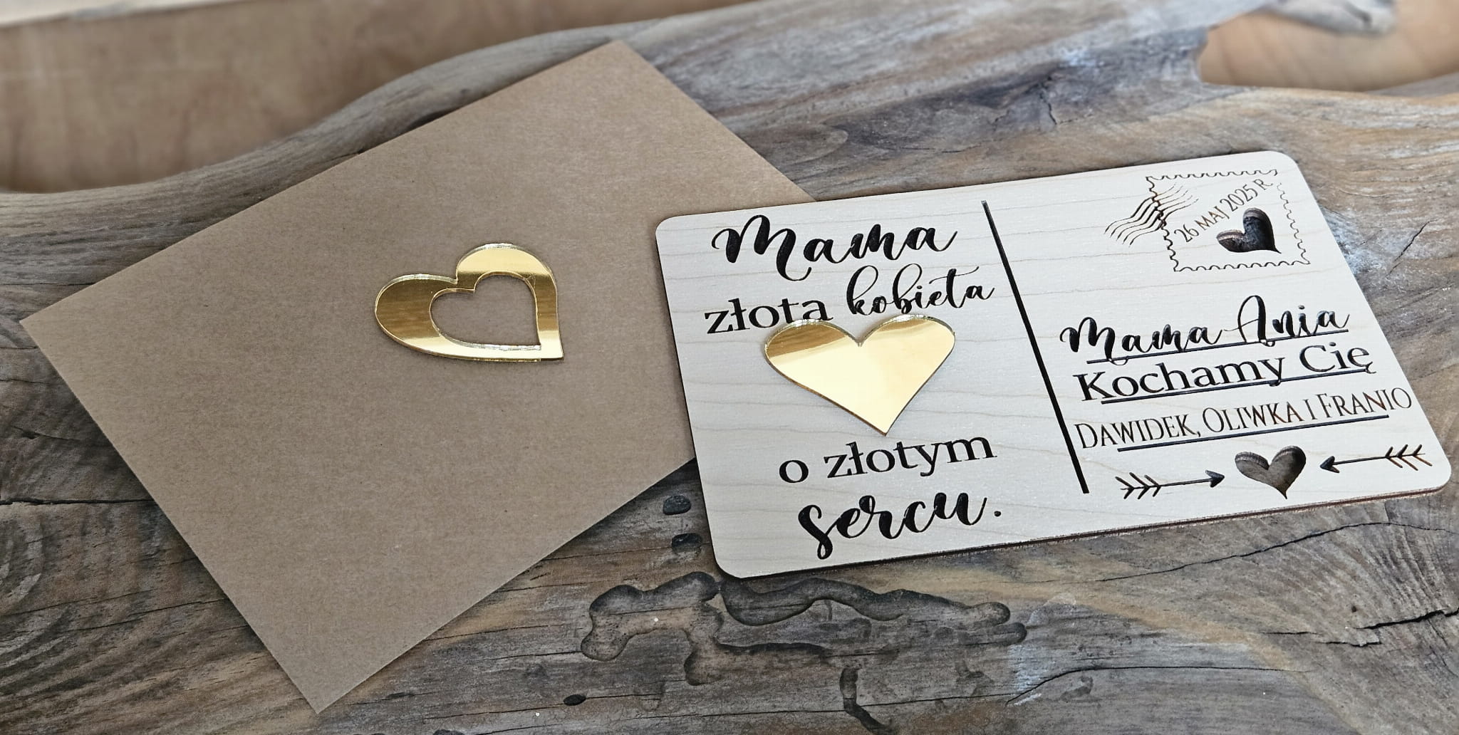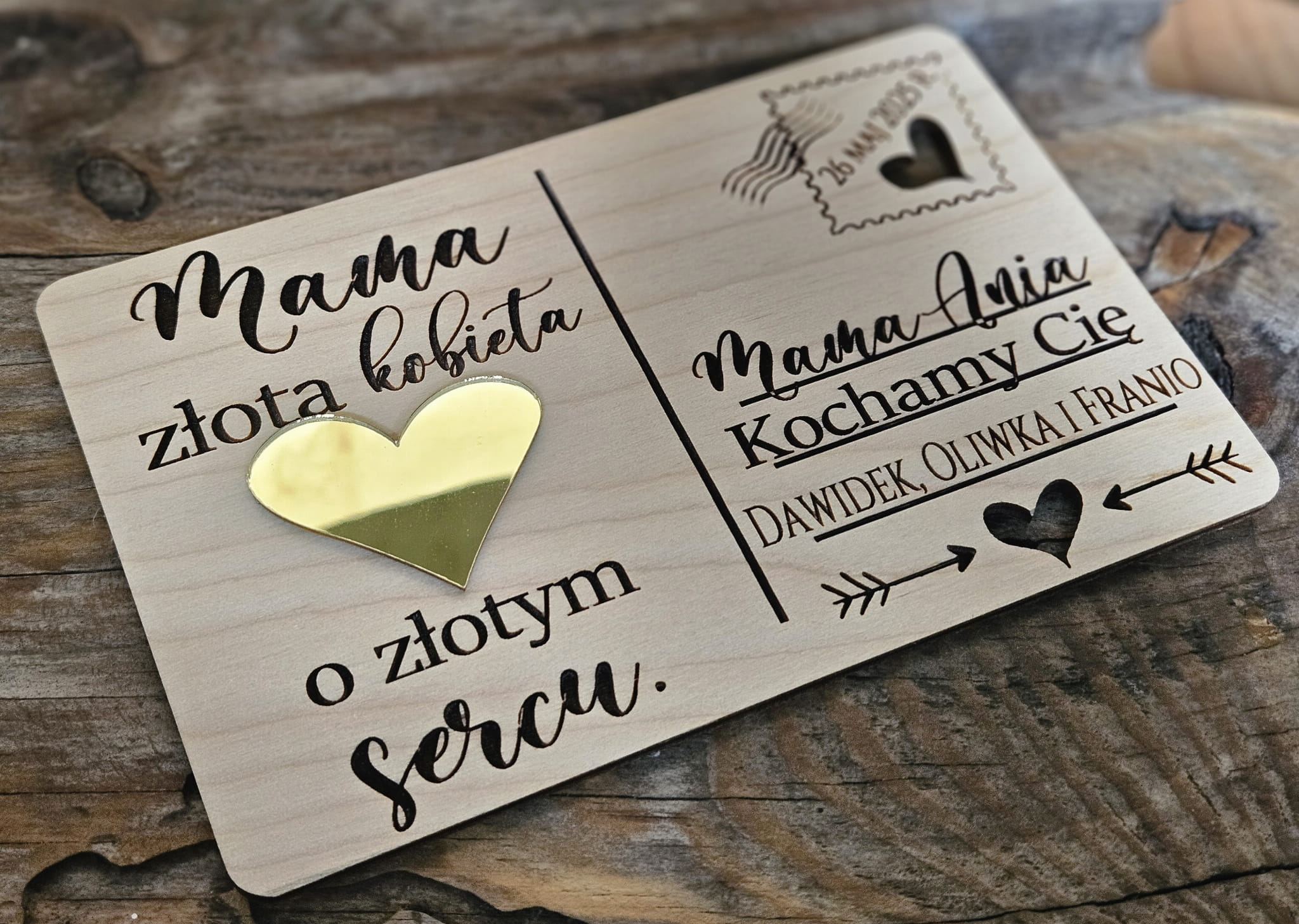 Zaskocz Mamę wyjątkową kartką, która pozostanie z nią na długo – personalizowana, drewniana pocztówka z magnesem i dekoracyjnym sercem z akrylu. To nie tylko życzenia, ale i trwała pamiątka na lodówkę!