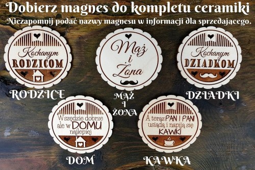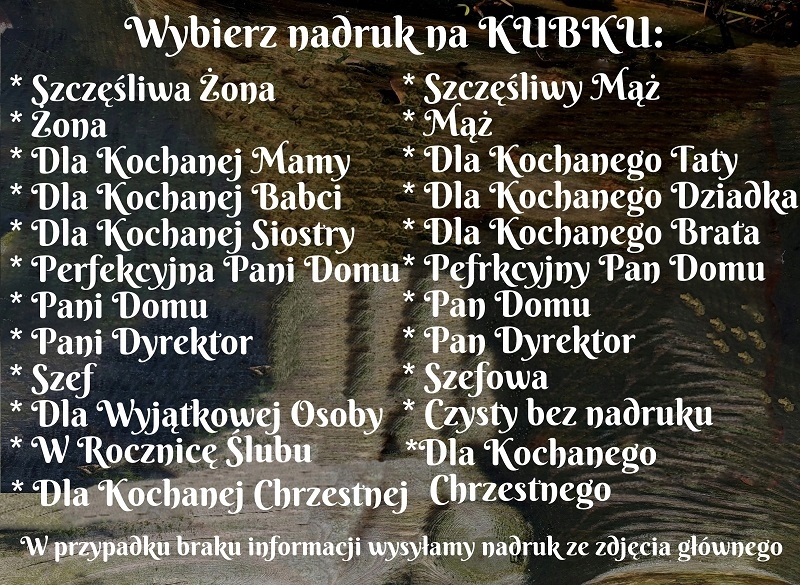 Jeśli chcesz otrzymać komplet z kubkami (każdy o pojemności 400ml) wybierz podczas zakupu opcje "ZAPAKUJ NA PREZENT" i podaj nadruk z poniższej listy.