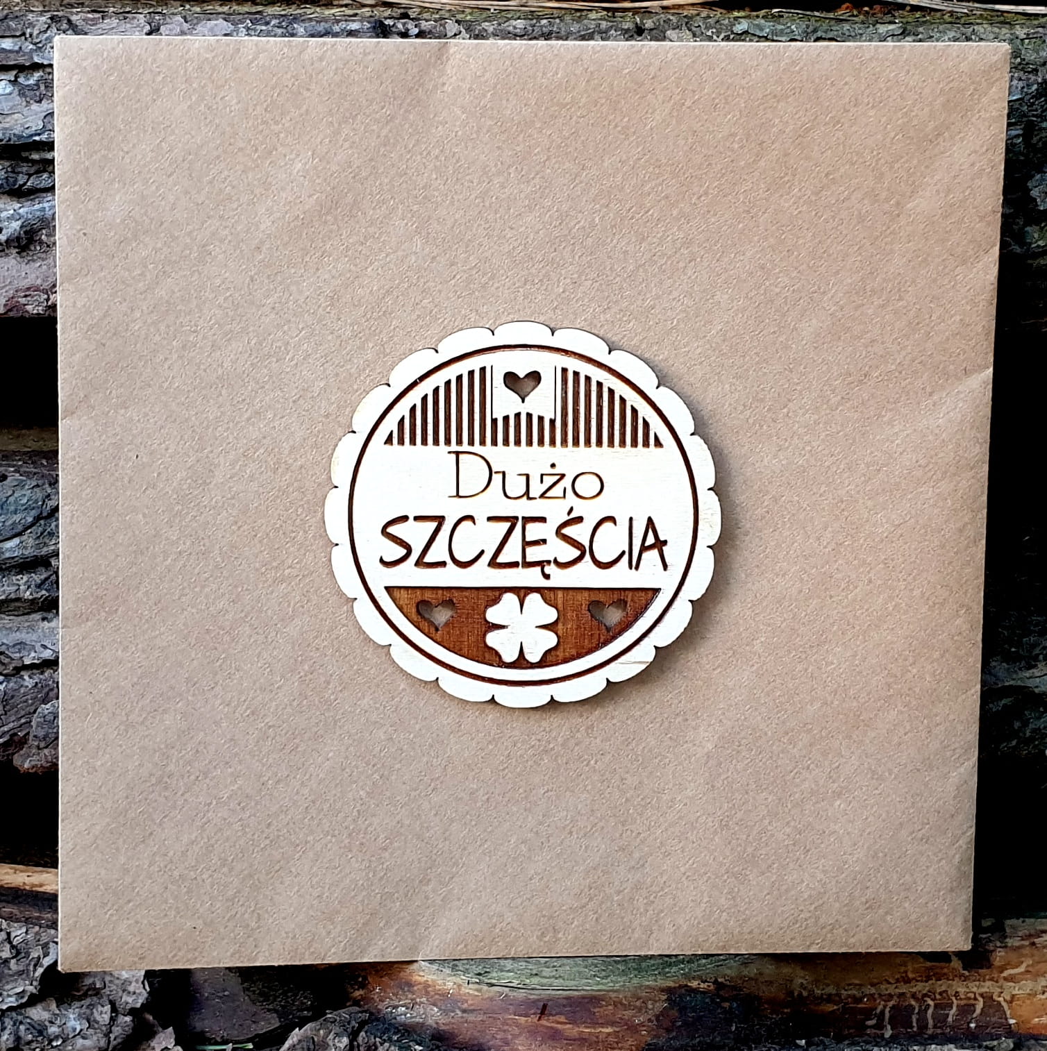 Kopertę udekorujemy dodatkowym drewnianym magnesem "Dużo Szczęścia".