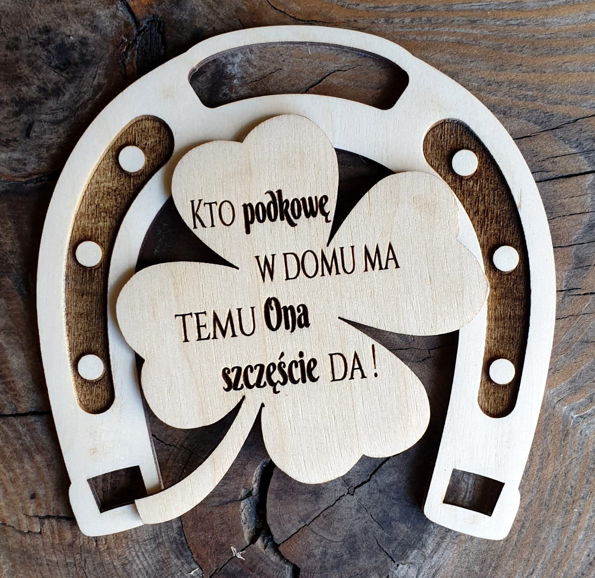 Szkatułka zawiera upominek w postaci Drewnianej Podkowy na Szczęście: