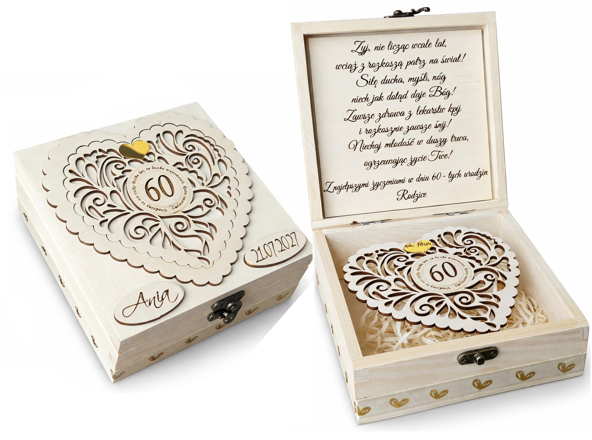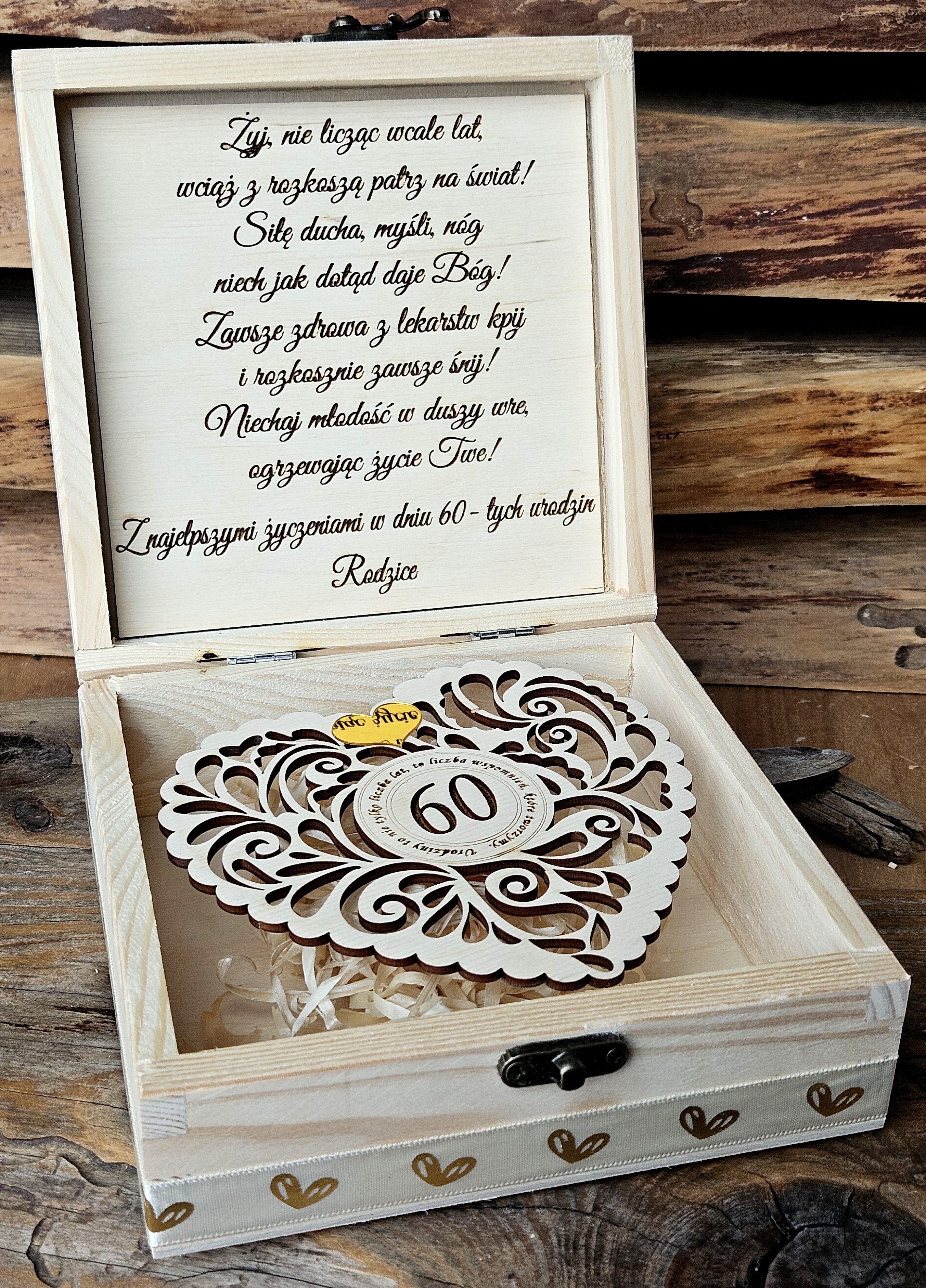 Elegancka drewniana szkatułka z personalizacją to wyjątkowy prezent na urodziny – niezależnie od wieku jubilata. Naturalne drewno, ozdobne ażurowe serce oraz indywidualny grawer sprawiają, że jest to piękna pamiątka na długie lata. Wewnątrz znajduje się grawerowana dedykacja z życzeniami, dzięki czemu prezent nabiera osobistego charakteru.