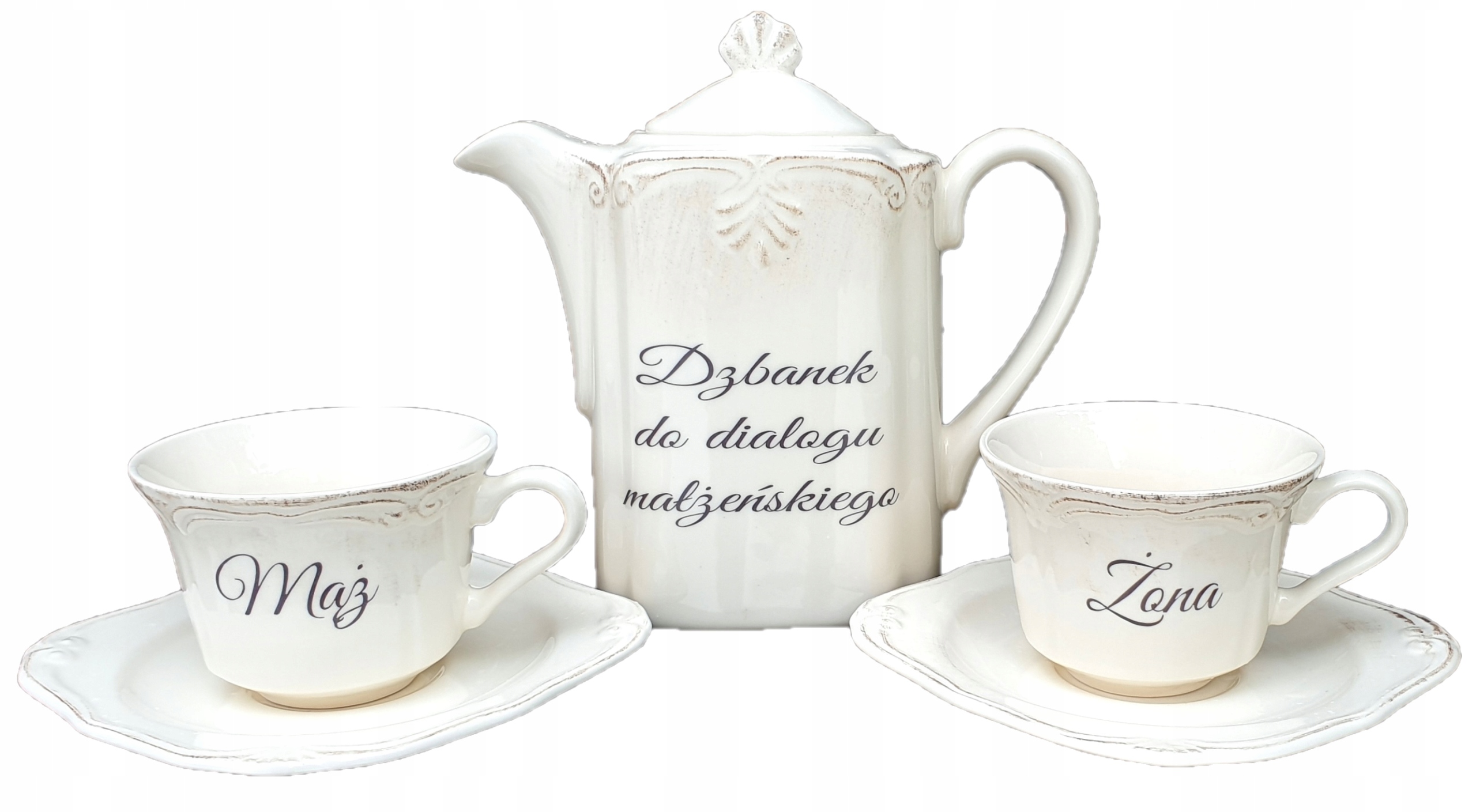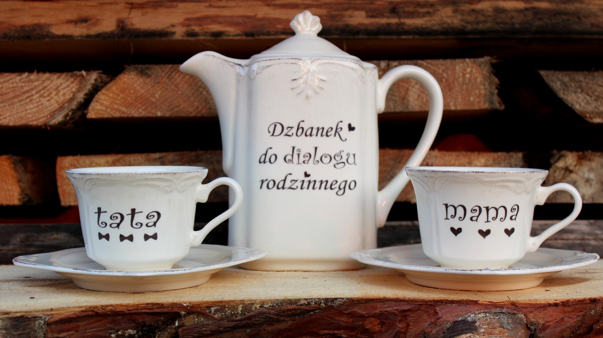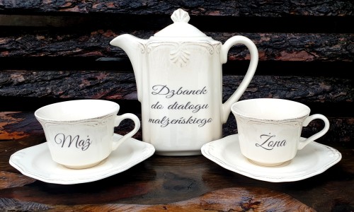 Nadruki na filiżankach z pełną elegancji czcionką oraz odpowiednio dobraną dedykacją na dzbanku nadają ceramice ciepła i serdeczności.