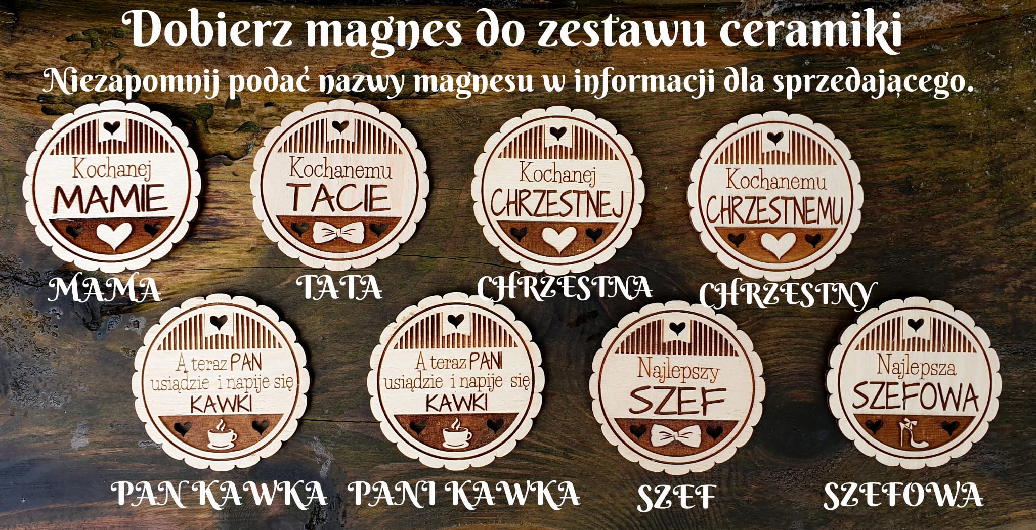 wybrany wzór drewnianego magnesu (na podstawie przedstawionej listy w galerii zdjęć) np. Dziękujemy.