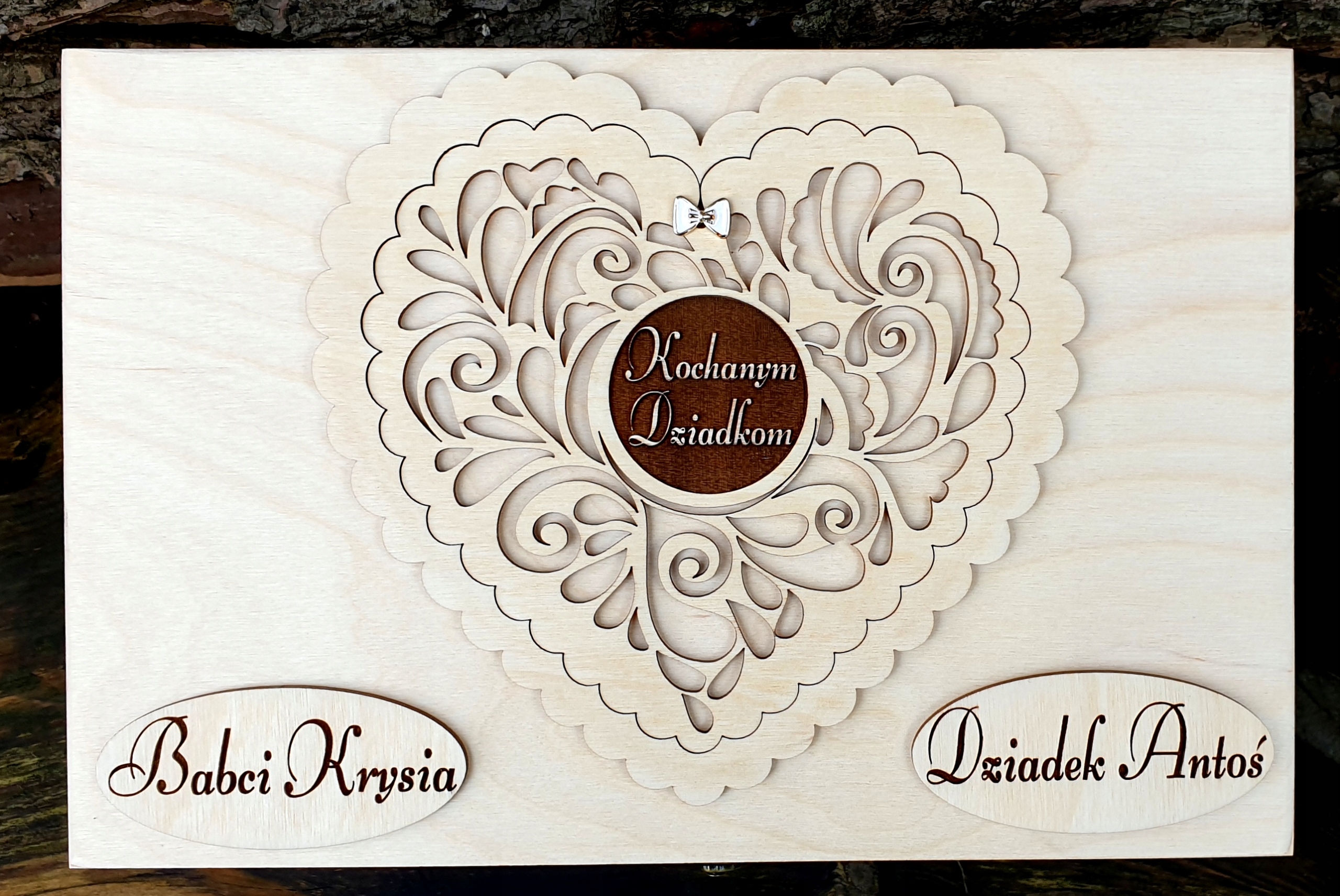 - dekoracyjny grawer z życzeniami na drewnianym sercu wewnątrz szkatułki.