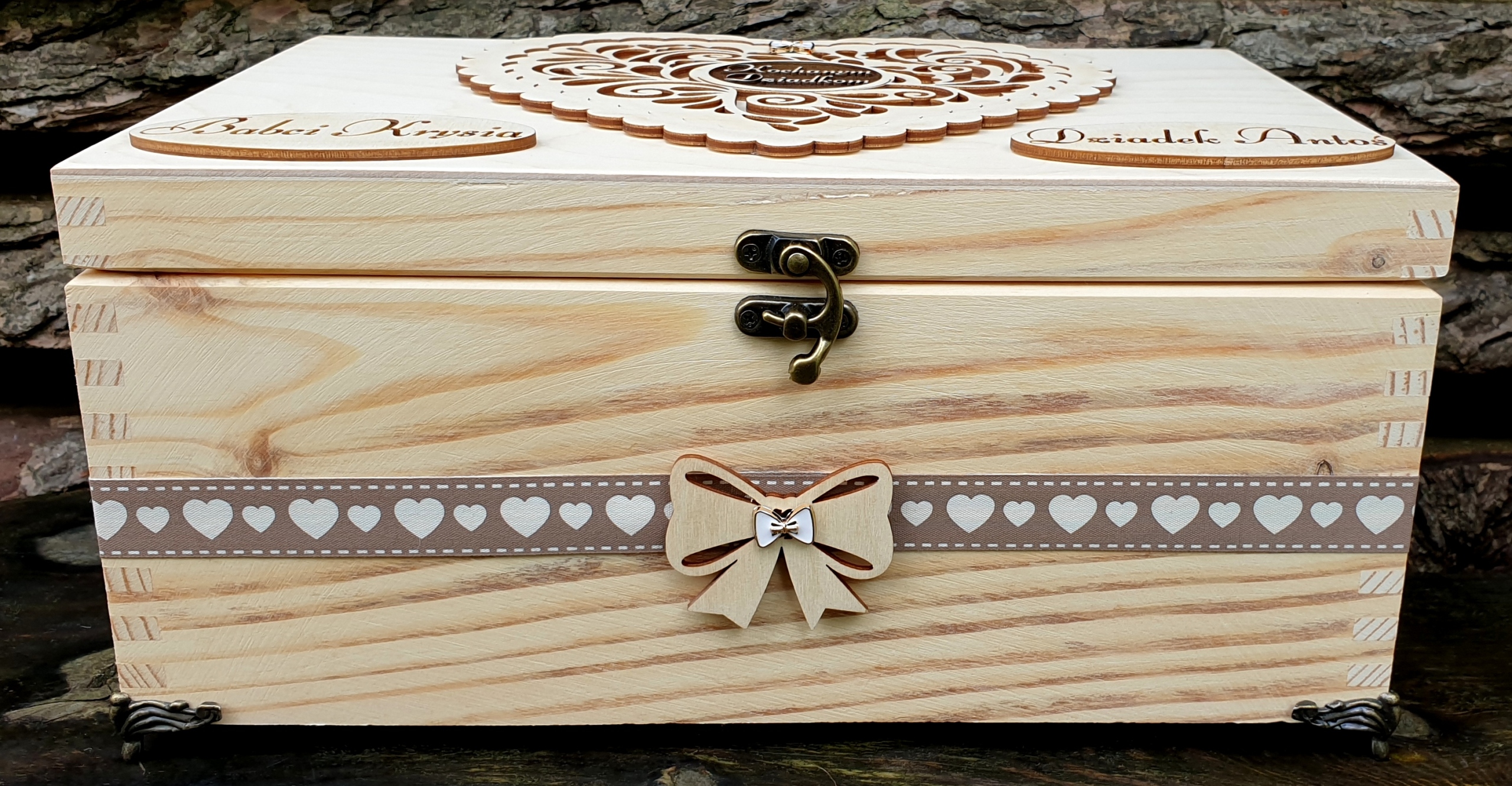 - szkatułka z życzeniami oraz dekoracyjne zamknięcie wraz z mosiężnymi nóżkami,