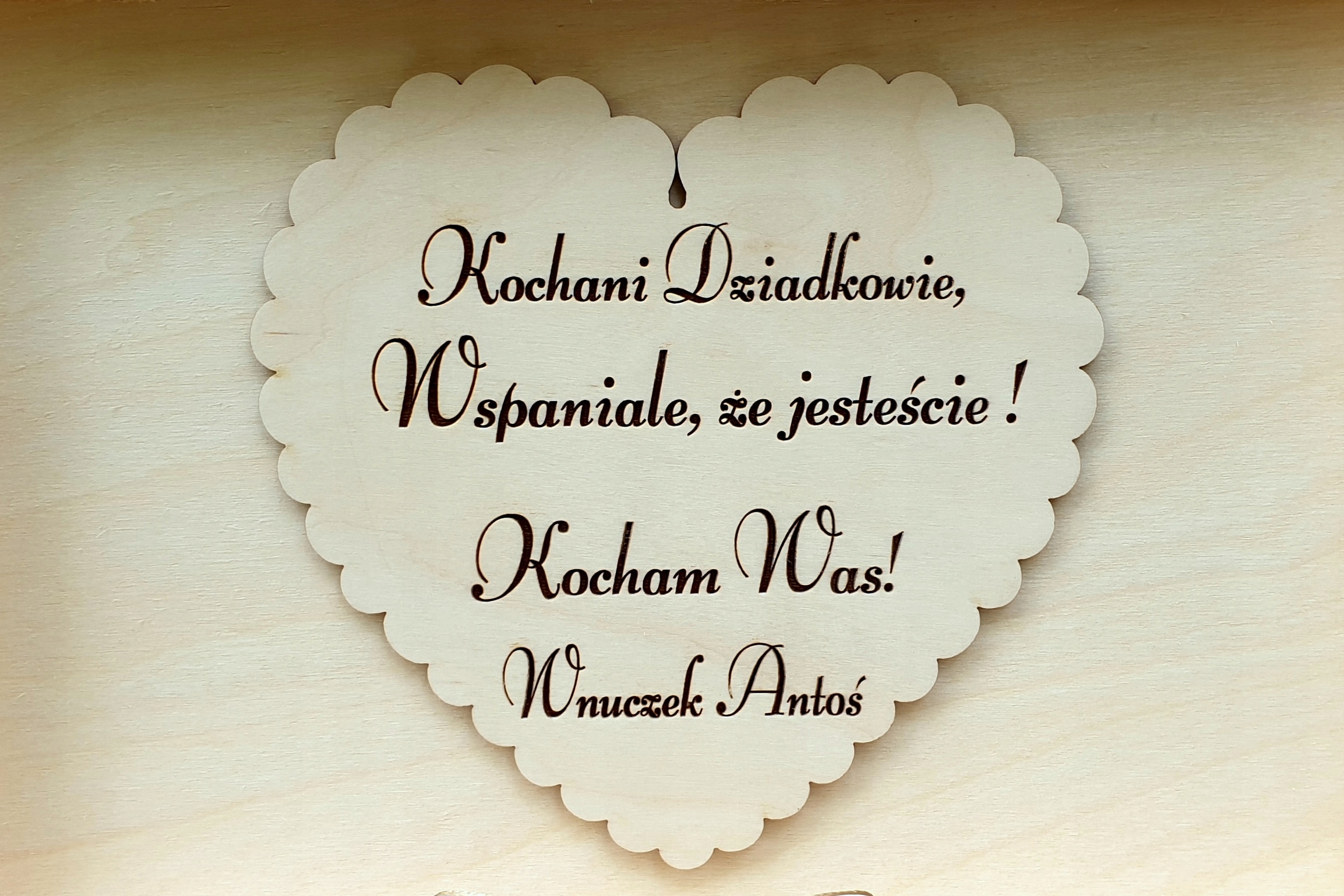 Zamiast przykładowego tekstu na drewnianym sercu wewnątrz szkatułki: "Kochani Dziadkowie. Wspaniale, że jesteście....". Można podać własny tekst do 7 słów.