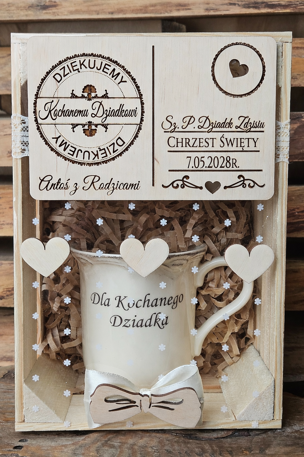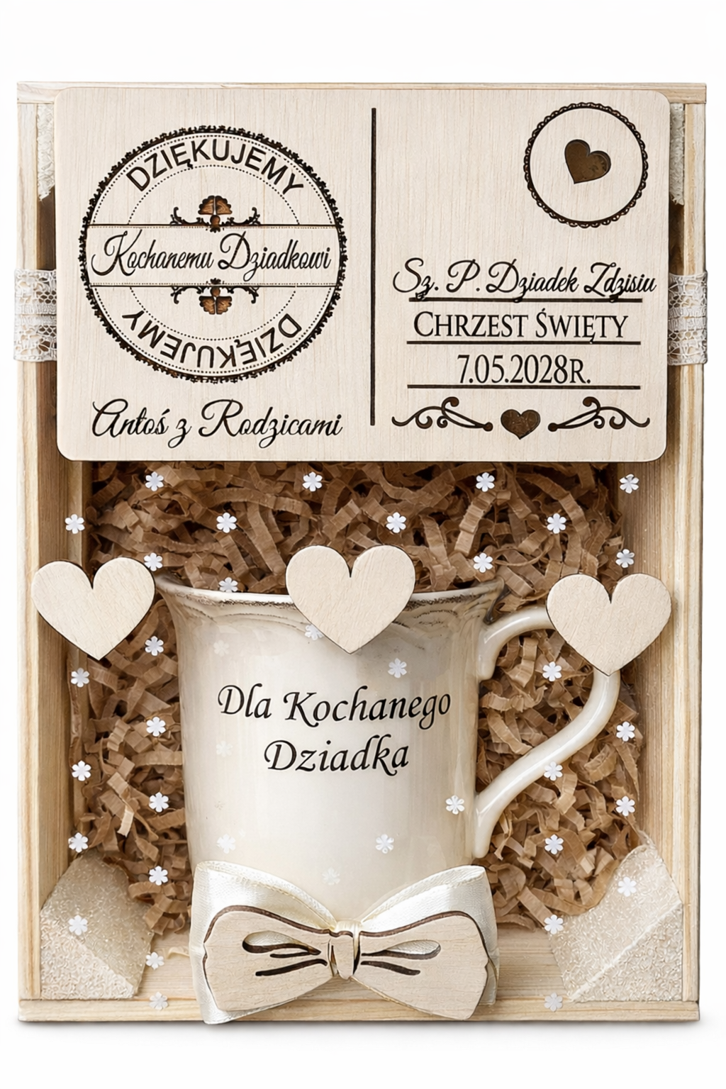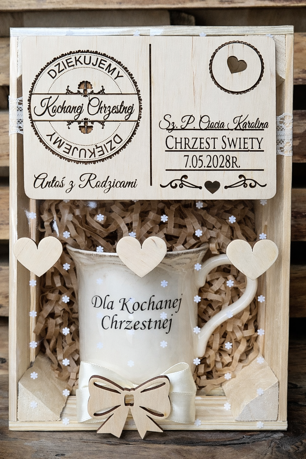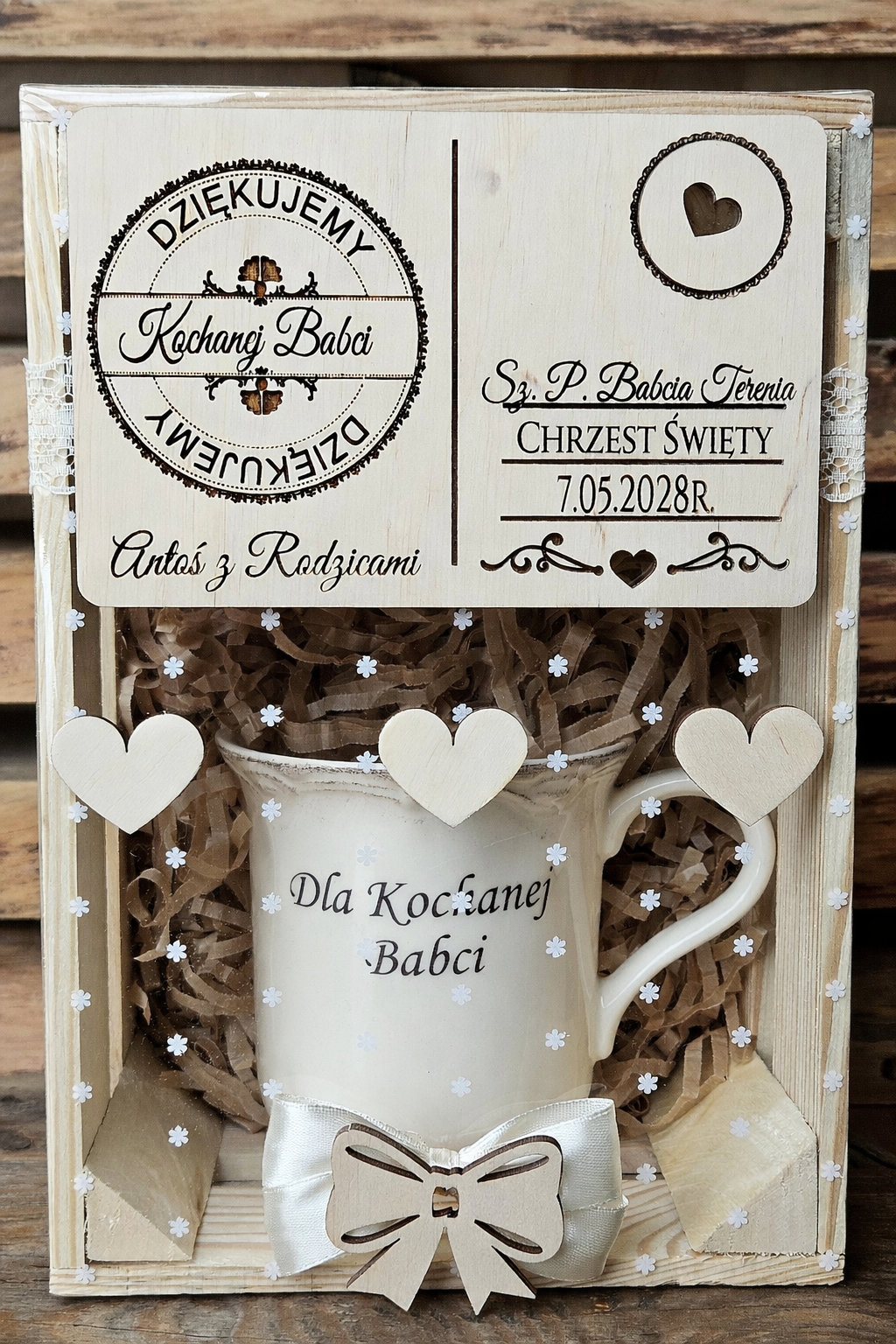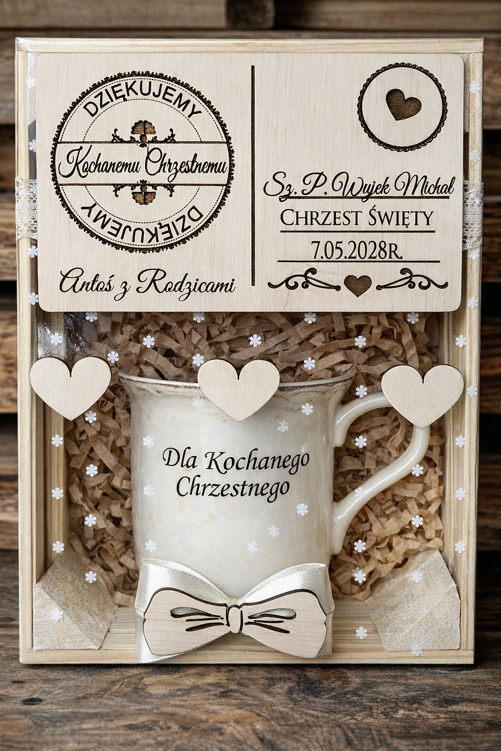 Zestaw podziękowań z okazji Chrztu Świętego – kubek + spodek + drewniana kartka w skrzynce
